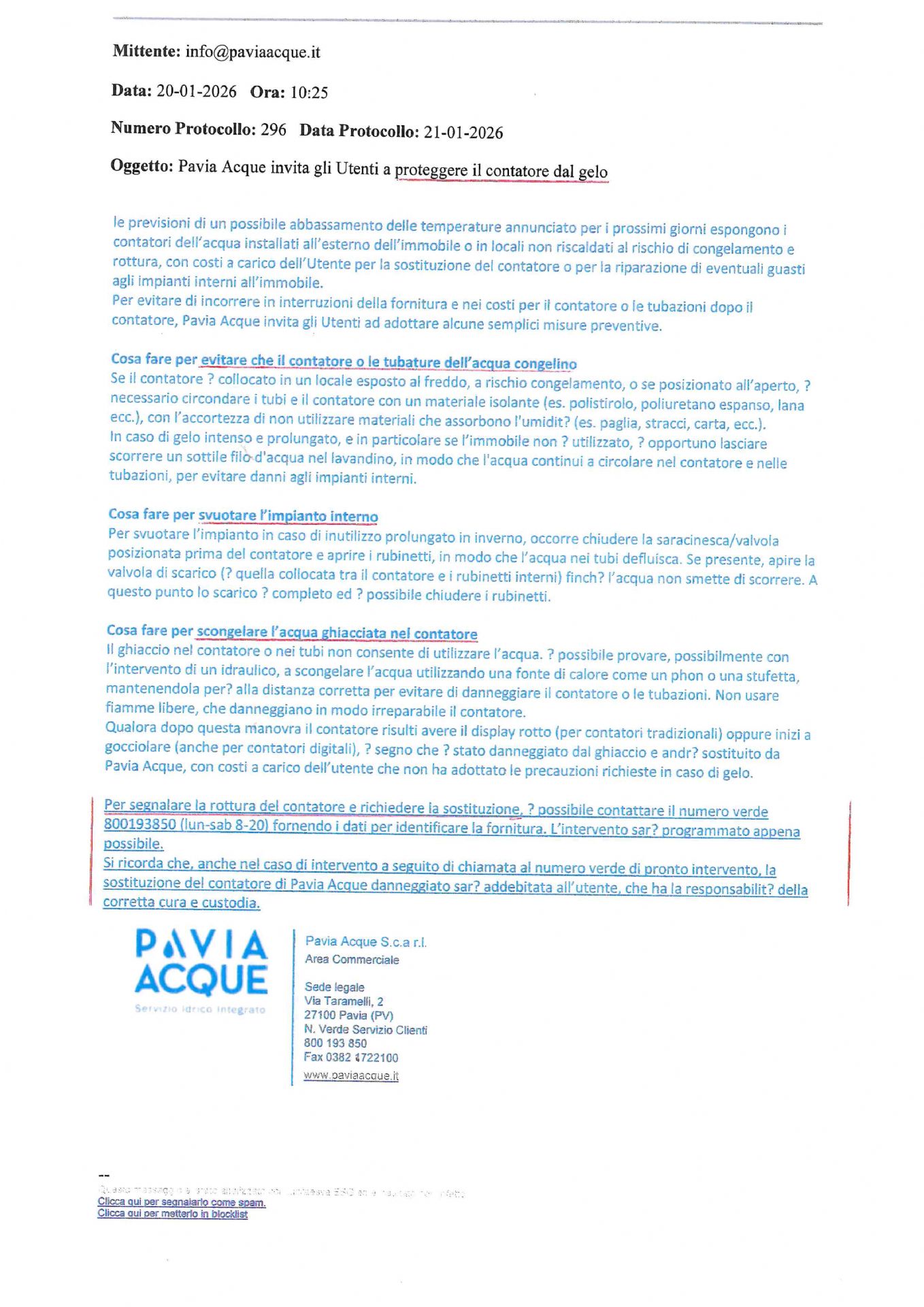 Si allega l'avviso diramato da Pavia Acque in vista del rischio di congelamento e rottura tubazioni idriche.
