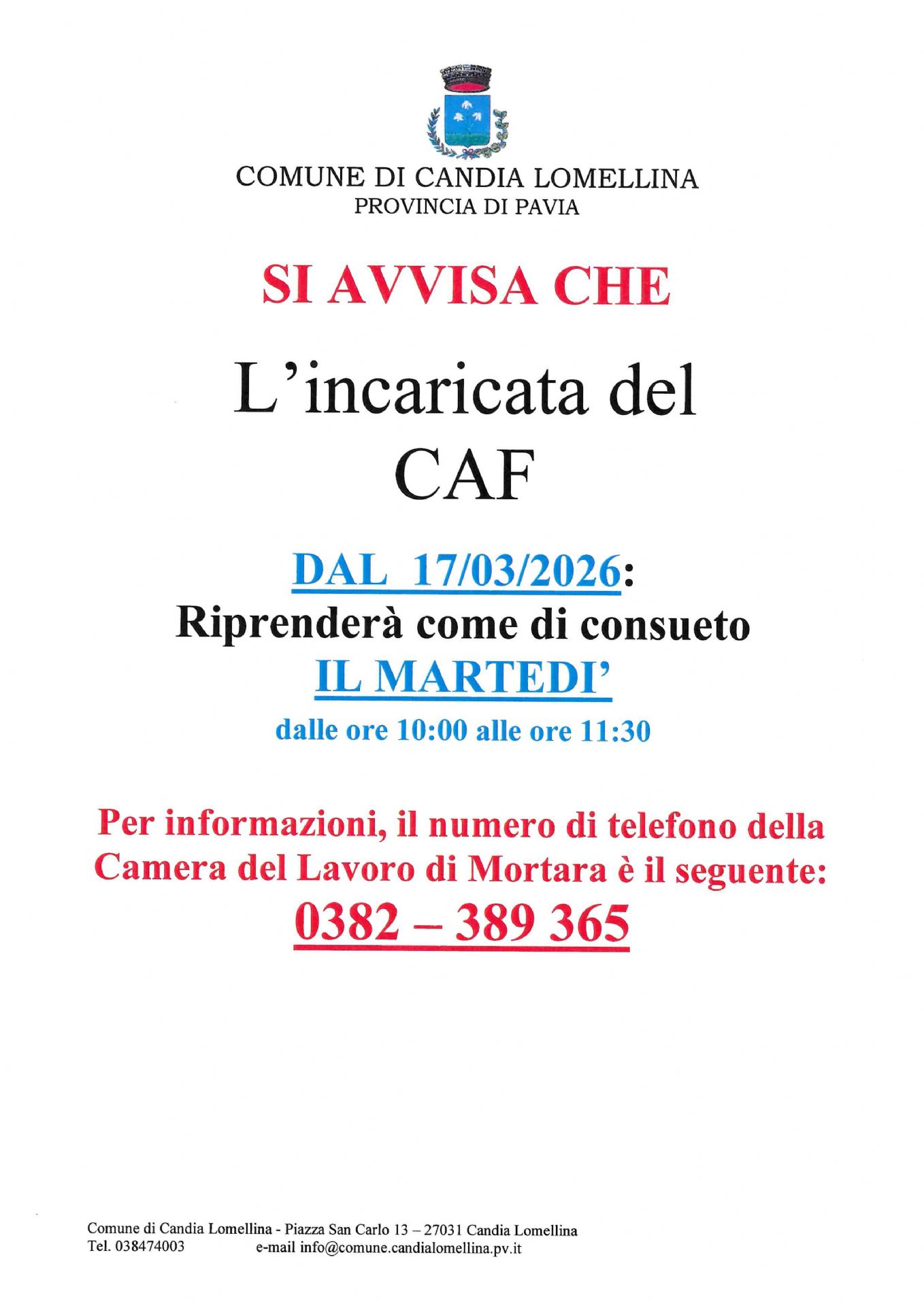 Si comunica che dal 17/03/2026 il Caf tornerà ad essere presente il martedì come da avviso pubblicato.