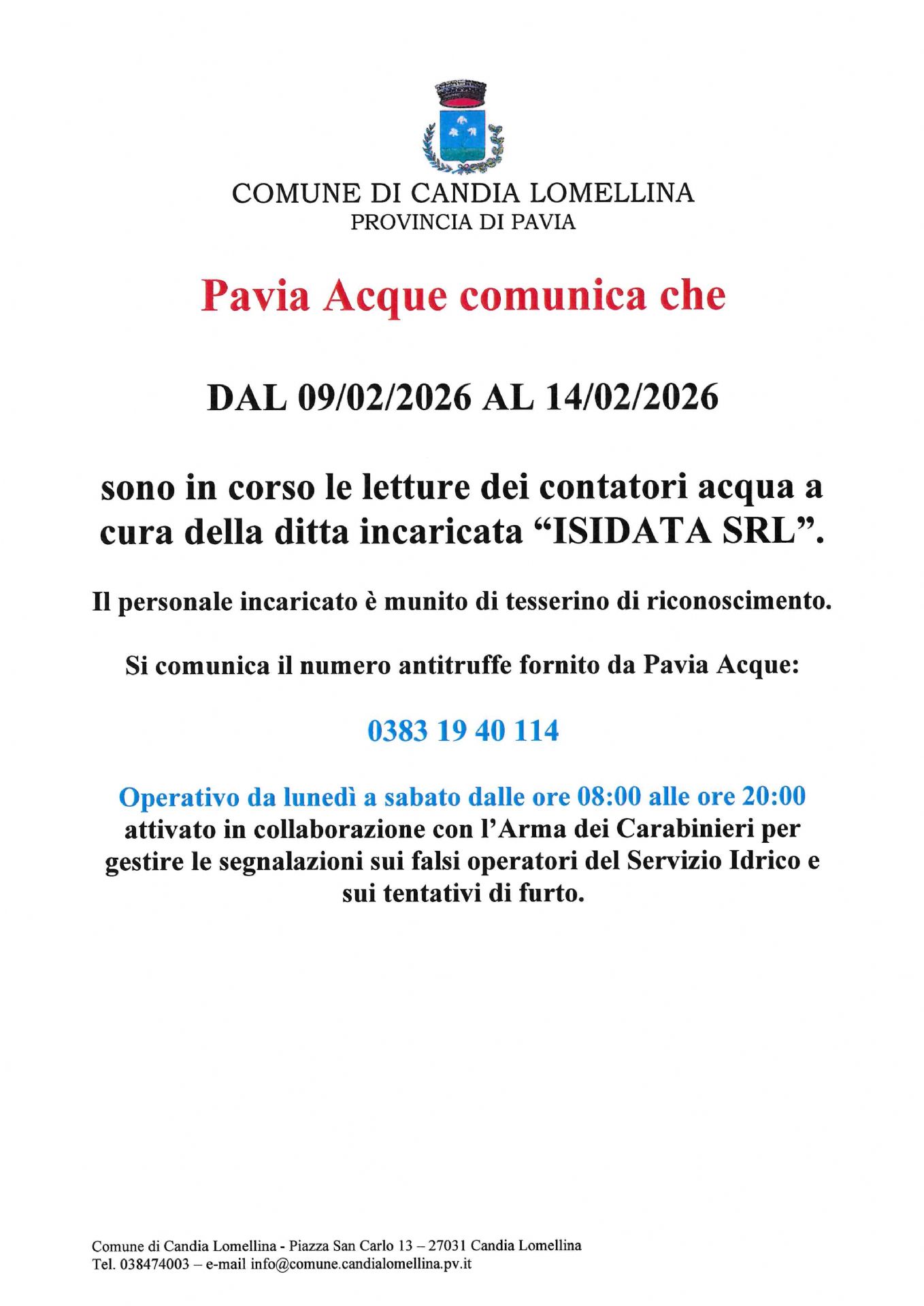 Pavia Acque comunica che sta effettuando la lettura contatori.