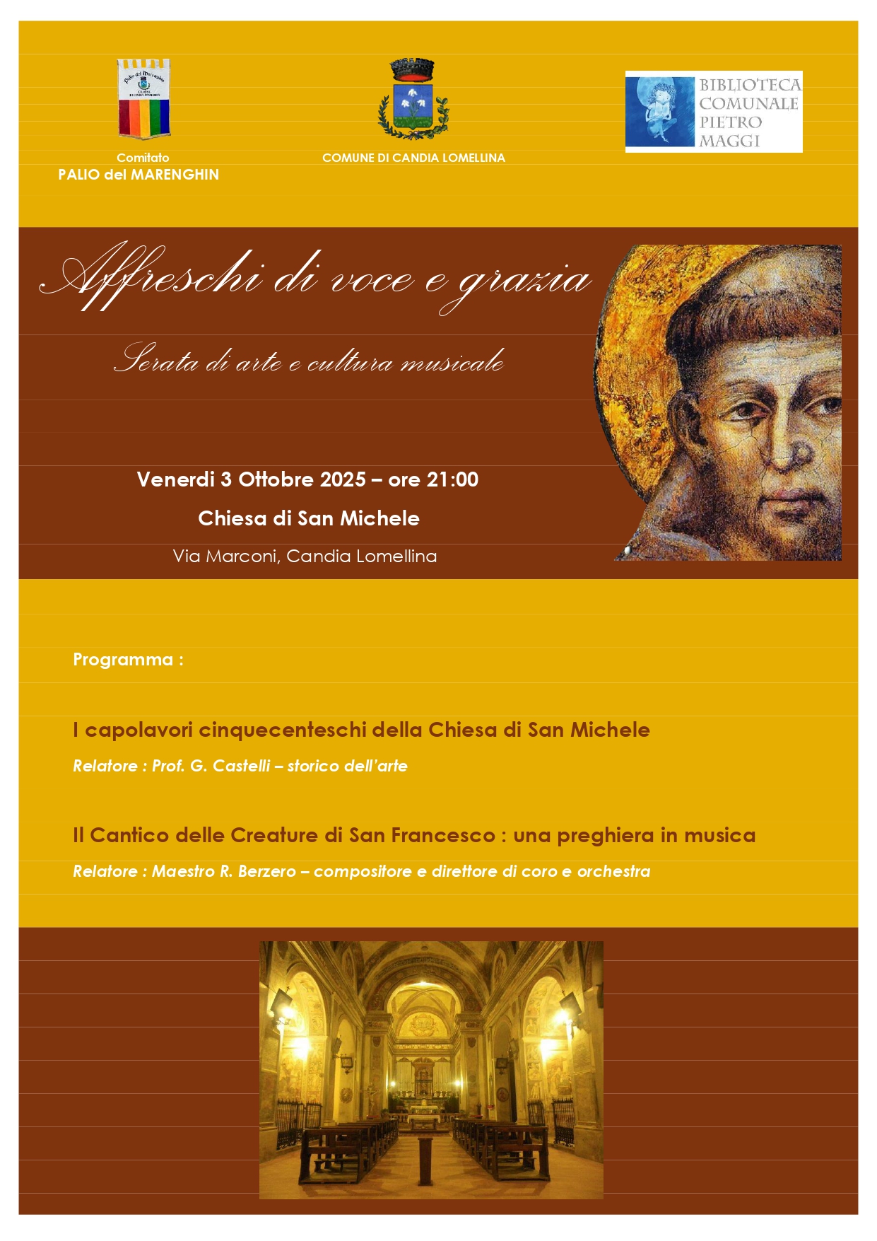 Venerdì 3 Ottobre ore 21.00 Chiesa San Michele: "Affreschi di voce e grazia" serata di arte e cultura musicale a cura del Prof. Giuseppe Castelli e del Maestro Roberto Berzero, in collaborazione con la Biblioteca Comunale Pietro Maggi