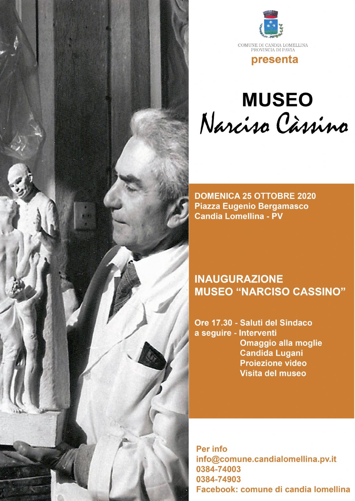 Domenica 25 ottobre 2020 in Piazza Eugenio Bergamasco - Candia Lomellina alle ore 17:30, inaugurazione del museo "Narciso Cassino".