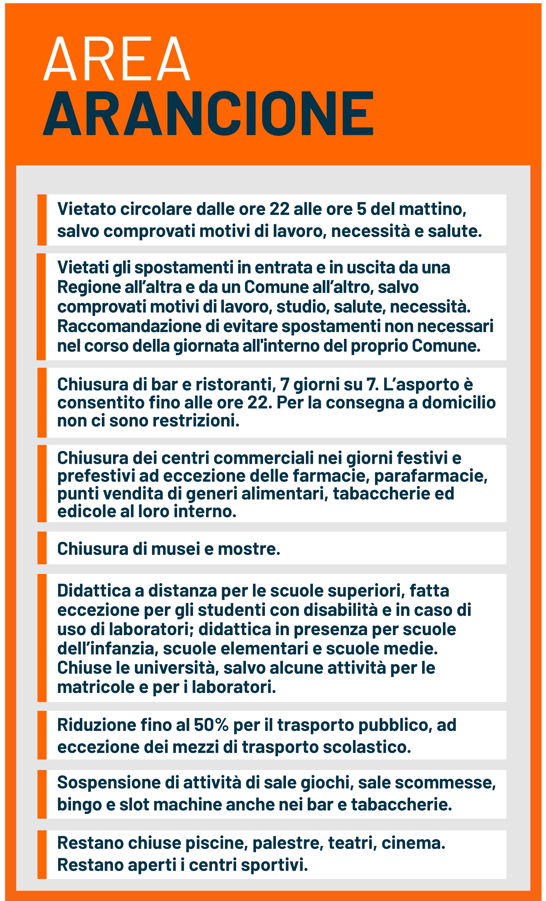 Nell'area arancione è previsto il coprifuoco dalle 22 alle 5 del mattino salvo comprovati motivi di lavoro, necessità e salute, con la raccomandazione di non spostarsi se non per motivi di salute, lavoro, studio, situazioni di necessità e sono vietati gli spostamenti in entrata e in uscita da una Regione all'altra e da un Comune all'altro, salvo comprovati motivi con la raccomandazione di evitare spostamenti non necessari nel corso della giornata anche all'interno del proprio Comune. Bar e ristoranti sono chiusi 7 giorni su 7, resta consentito l'asporto fino alle ore 22 e per la consegna a domicilio non ci sono restrizioni. Per i centri commerciali è prevista la chiusura nei giorni festivi e prefestivi ad eccezione delle farmacie, parafarmacie, punti vendita di generi alimentari, tabaccherie ed edicole al loro interno mentre mostre e musei sono sempre chiusi. Per quanto concerne il trasporto pubblico è prevista una riduzione dei passeggeri fino al 50%, ad eccezione dei mezzi di trasporto scolastico. Le attività di sale giochi, sale scommesse, bingo e slot machine sono sospese (anche nei bar e nelle tabaccherie).Bar e ristoranti sono chiusi 7 giorni su 7 mentre resta consentito l'asporto fino alle ore 22 e per la consegna a domicilio non ci sono restrizioni. Restano chiuse piscine, palestre, teatri, cinema. Restano aperti i centri sportivi.