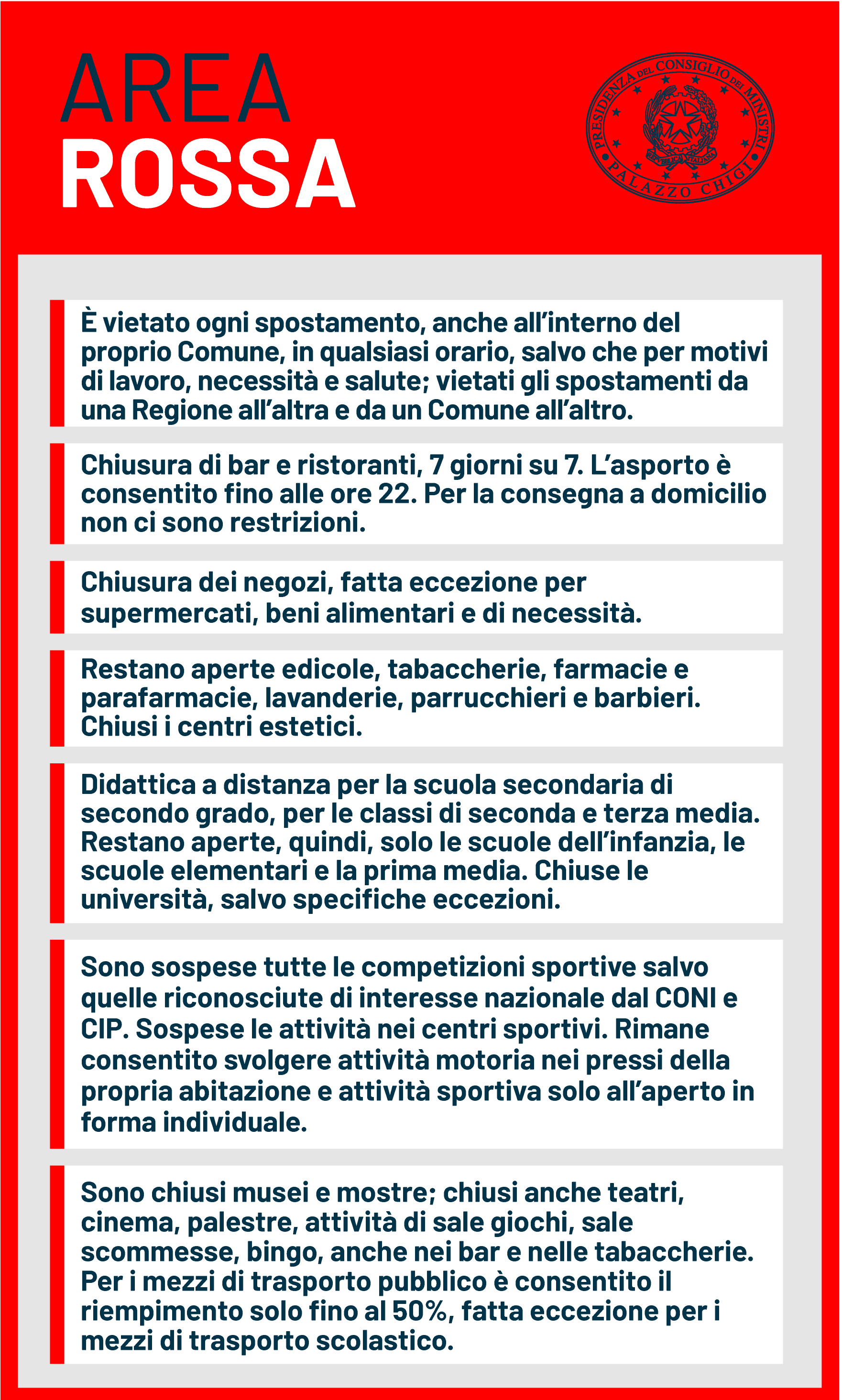 Nell'area rossa è vietato ogni spostamento anche all'interno del proprio Comune, in qualsiasi orario, salvo che per motivi di lavoro, necessità e salute, sono di conseguenza vietati gli spostamenti da una Regione all'altra e da un Comune all'altro. Bar e ristoranti sono chiusi 7 giorni su 7 mentre resta consentito l'asporto fino alle ore 22 e per la consegna a domicilio non ci sono restrizioni. I negozi sono chiusi fatta eccezione per supermercati, beni alimentari e di necessità. Restano aperte edicole, tabaccherie, farmacie e parafarmacie, lavanderie, parrucchieri e barbieri. Chiusi i centri estetici. È prevista la didattica a distanza per la scuola secondaria di secondo grado, per le classi di seconda e terza media. Restano aperte, quindi, solo le scuole dell'infanzia, le scuole elementari e la prima media. Sono chiuse anche le università, salvo specifiche eccezioni.