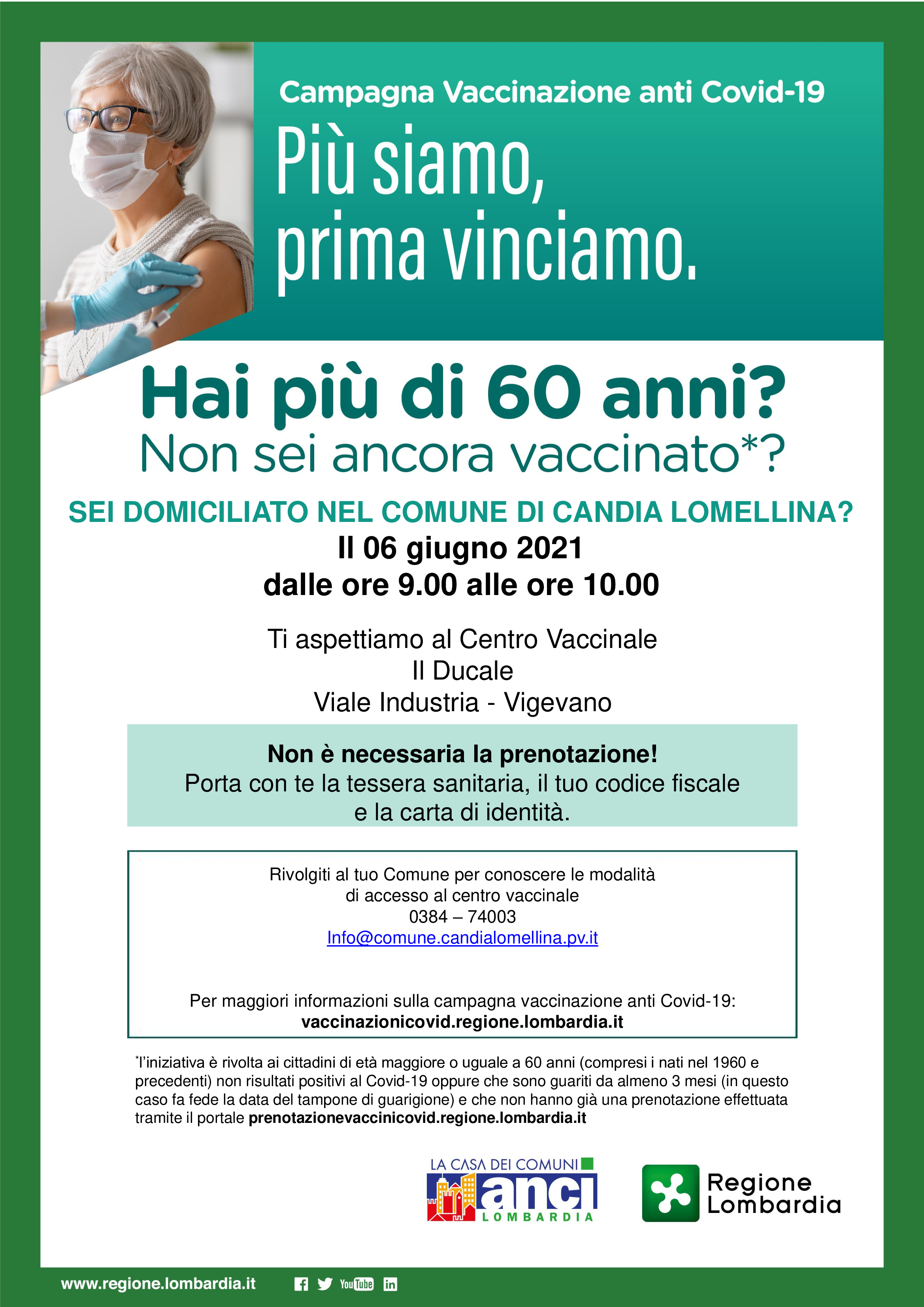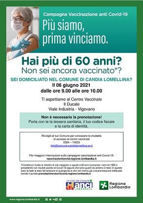 Per gli over 60 che ancora non sono vaccinati e sono domiciliati a Candia Lomellina è possibile presentarsi SENZA PRENOTAZIONE domenica 6 giugno a Vigevano presso il centro commerciale "Il Ducale" dalle ore 9:00 alle ore 10:00.