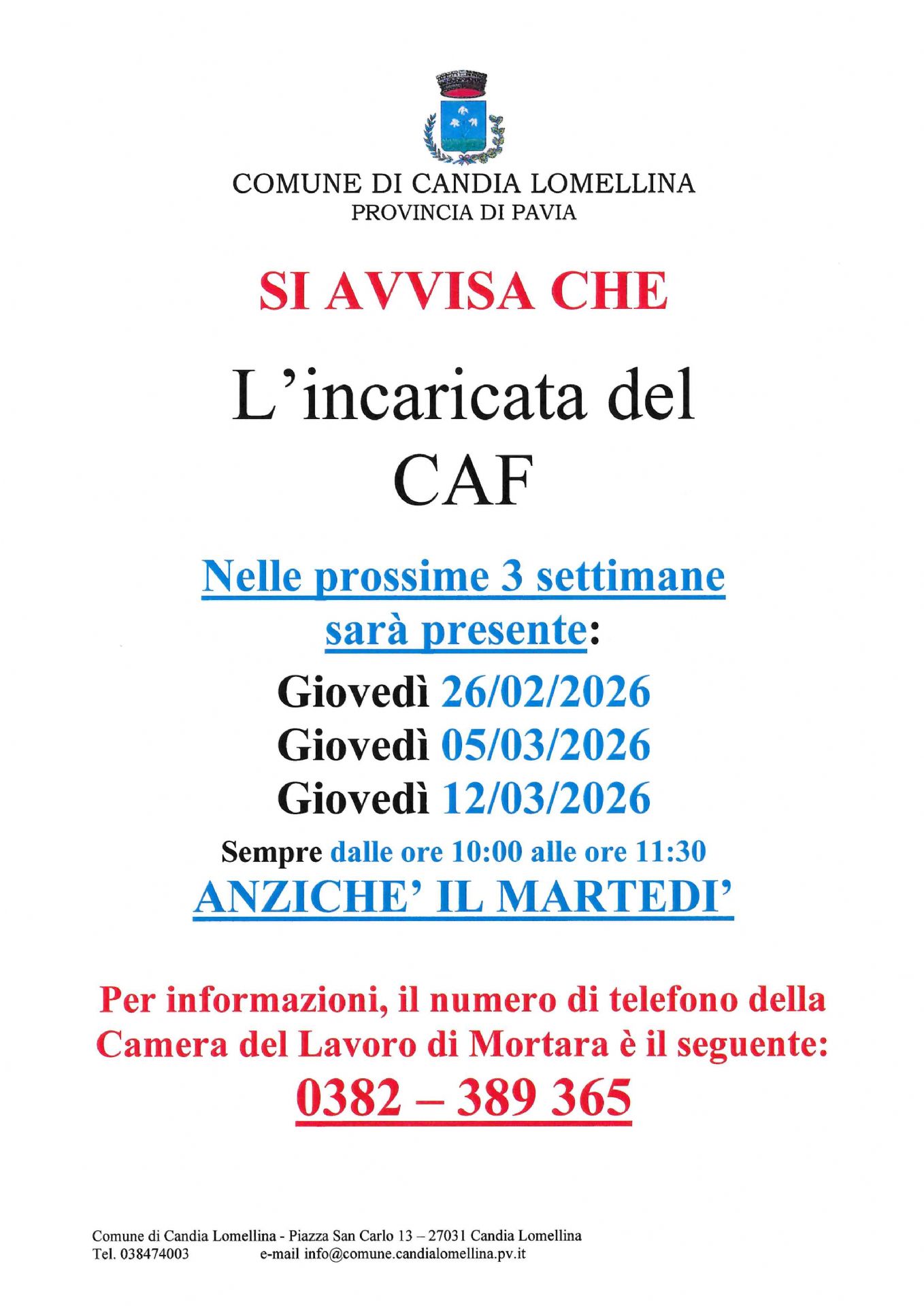 Si avvisa che il servizio CAF per impegni dell'incaricata, per le prossime 3 date, viene spostato dal martedì al giovedì osservando gli stessi orari, come da avviso allegato.