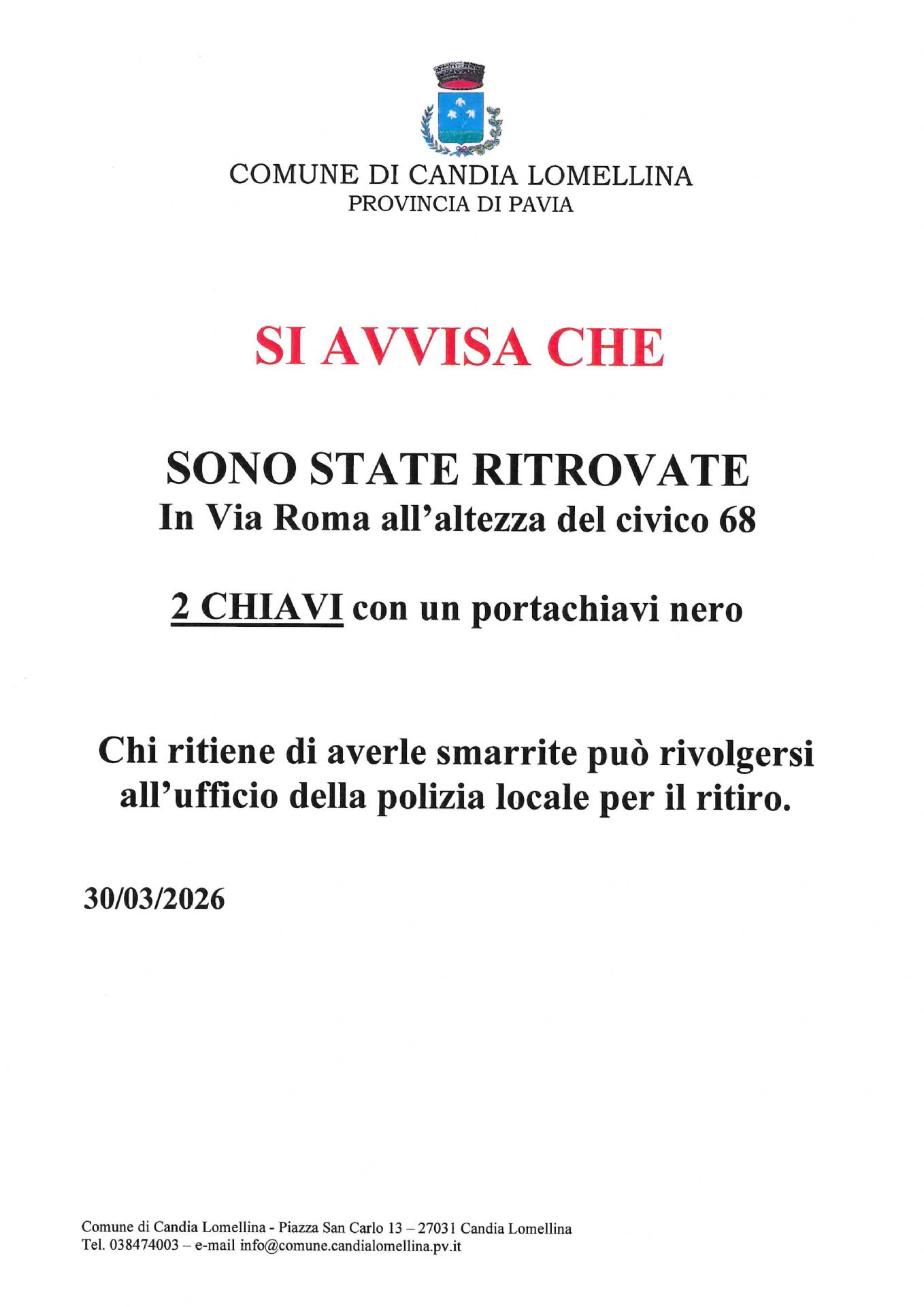 Sono state ritrovate 2 chiavi in via Roma all'altezza del civico 68.